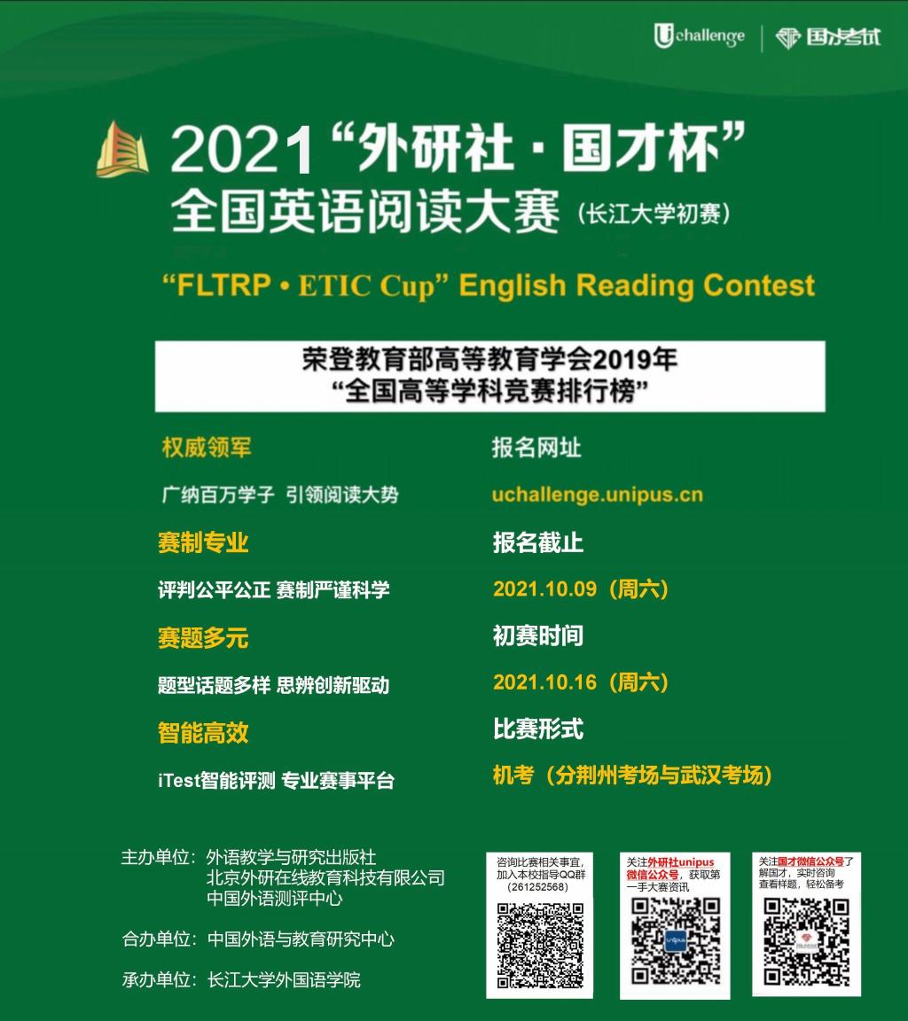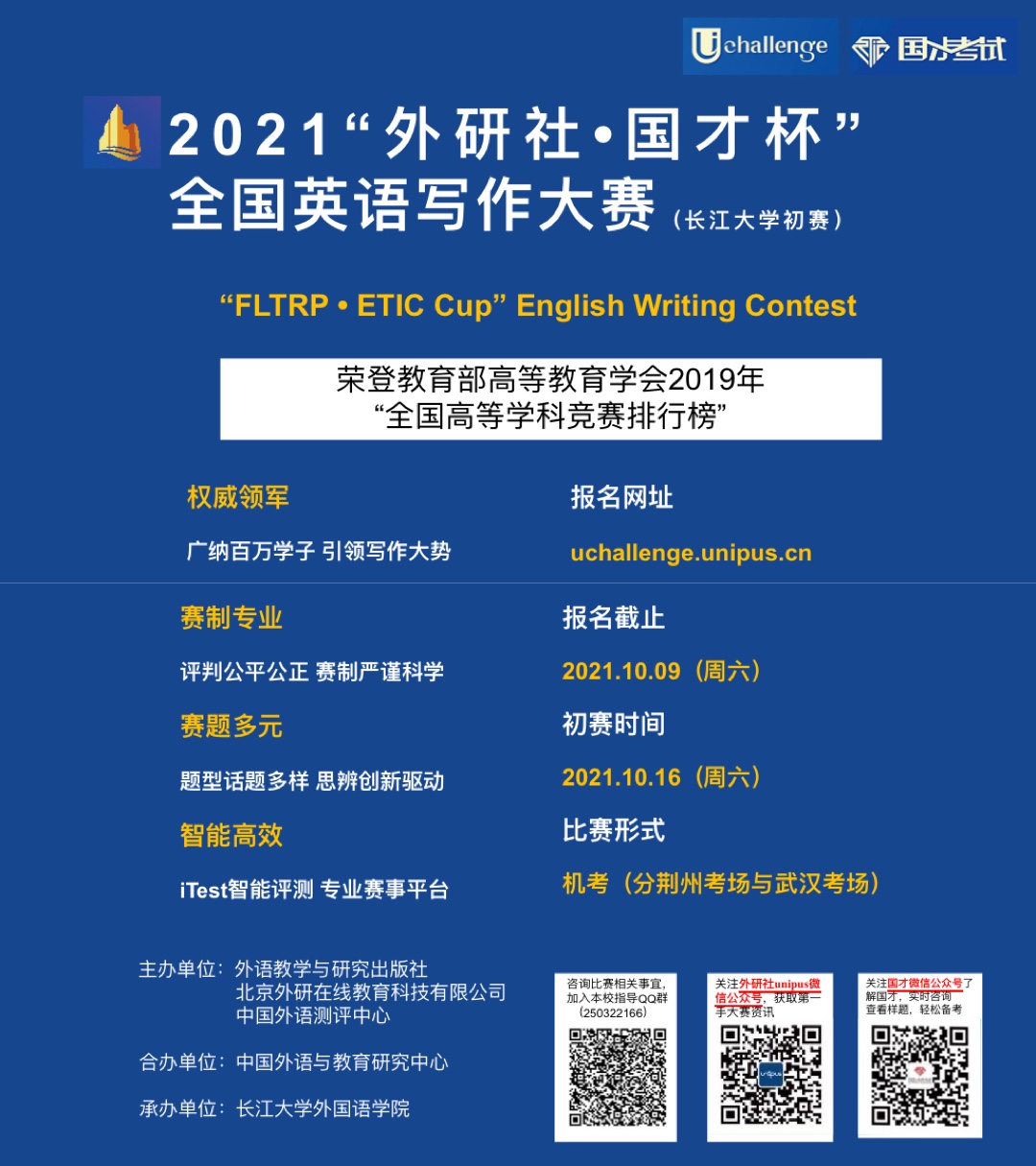 2021“外研社•国才杯”全国英语阅读、写作大赛火热报名中该赛事为公益性赛事,不收取报名费,欢迎必赢bwin官方网站在校生踊跃报。