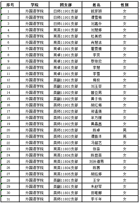 根据《共青团推优入党工作实施办法(试行)》(中青发〔2019〕9号)、《共青团必赢bwin官方网站委员会推优工作实施细则》(长大团发〔2017〕8号)文件精神,经各班团支部大会推优投票表决、院团委审核,报外语学院党委审查同意,2021半年团内“推优”“党的发展对象”的同学名单公示如下: