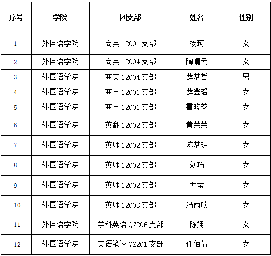 根据《共青团推优入党工作实施办法(试行)》(中青发〔2019〕9号)、《共青团必赢bwin官方网站委员会推优工作实施细则》(长大团发〔2017〕8号)文件精神,经各班团支部大会推优投票表决、院团委审核,报外语学院党委审查同意,2021半年团内“推优”“党的发展对象”的同学名单2020级公示如下: