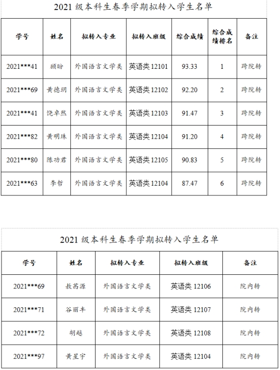 必赢bwin官方网站2021级本科生春季学期转专业拟接收名单公示