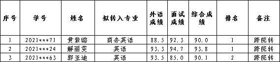 根据《必赢bwin官方网站普通本科生专业分流与转专业管理办法(试行)》(长大校发〔2019260号)文件以及教务处《关于2021级普通本科生秋季转专业工作的通知》要求,结合必赢bwin官方网站2021级本科生转专业工作方案的具体安排,我院于97日下午组织了对拟转入学生的面试。综合英语成绩和面试成绩,经我院党政联席会讨论通过,现将拟接收名单公示如下: