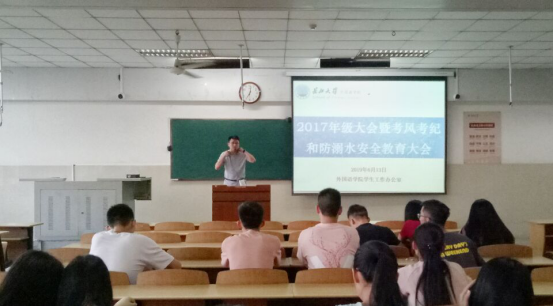 此次会议以严肃考风考纪,预防溺水事故发生,夏季文明着装规范以及17级其他事务为内容展开。车桥老师向与会17级同学传达了学院在这四个方面的要求和标准。车老师以曾经发生过的真实事件为案例,强调了考试要求的底线不要触碰,这不仅是对个人成绩的影响,更是个人人格上不光彩的一笔。车老师还表示,未来几天就是英语四六级和日语专四考试,希望大家都能遵守考场纪律,严格履行考场行为规范。紧接着,就防溺水安全问题,车老师从自救和互救技能上给学生们上了必要的一课,并再次强调了学生的人身安全问题。在着装规范上,车老师也进行了详细的阐述,并督促大家严格按照规定执行。最后车老师就最近几次的晚自习出勤情况以及存在的问题向大家公示,并希望大家能够珍惜最后几次的晚自习,给自己的大二生活画上一个圆满的句号。