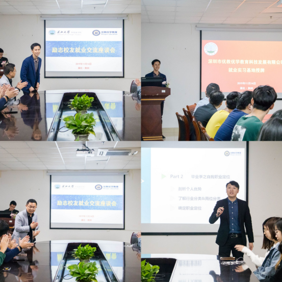 随后,主讲人毛飞发表讲话。在进行了简短的自我介绍后,他开始给在场同学们讲提高面试成功率的技巧,比如怎样制作吸引人的简历,面试时需注意的事项以及怎样选择适合自己的行业等。随后,他又介绍了深圳优教优学教育有限公司的相关内容,以及现在教育行业的一些情况。他提出,毕业之际应该明确自我定位:首先要剖析个人优势,了解行业和职业岗位分类后,再确定自己的职业定位。在场的同学们掌声连连,对主讲人生动有趣的话语表示深刻的认同。