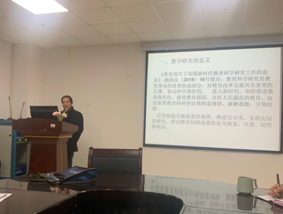交流活动邀请了教学项目评审及鉴定专家刘昌明教授做关于教学研究项目申报及结题的指导报告。刘教授首先谈到了教学研究项目的定位,指出教学研究是教学工作的重要组成部分,是提高教学质量的前置性工作,因此教学研究必须走在教学工作的前头,人民教师必须树立教研先行的理念。然后刘教授结合我院老师近年教学项目申报的选题及项目申请书的撰写,从选题、申请书各个内容的写作、结题报告的写作等做了针对性很强的详细指导。