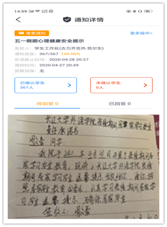 会议前,学院拟定了《必赢bwin官方网站疫情期间居家学习安全责任书》,运用辅导猫和家长微信群分别给学生和家长推送了“五一假期心理健康安全提示”并让学生与家长进行已读确认。