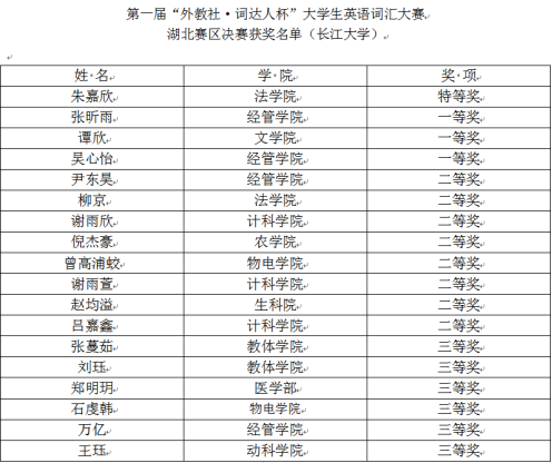 本次比赛由湖北省高等教育学会大学外语教学专业委员会与上海外语教育出版社共同主办,通过手机端“词达人”微信公众号进行线上答题方式进行,旨在更好地推动高校大学英语网络教学,提升大学英语智能化教学水平。共设特等奖10个、一等奖40个、二等奖80个、三等奖197个。