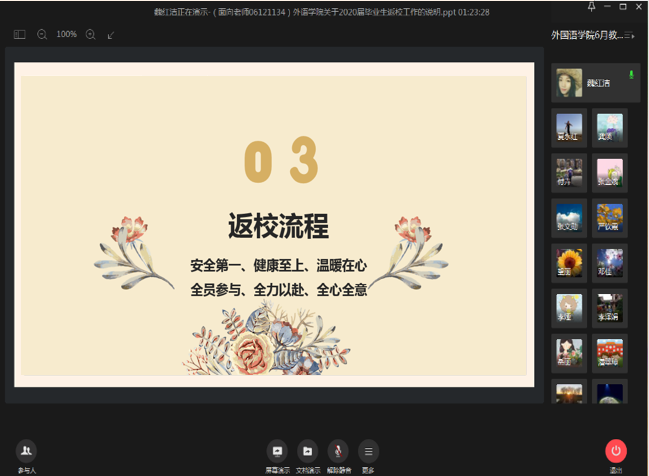 6月12日下午,我院通过“企业微信”召开了全体教职工音频会议,组织开展了政治理论学习,同时就2020届毕业生返校工作进行了动员。会议由院长谈宏慧主持。