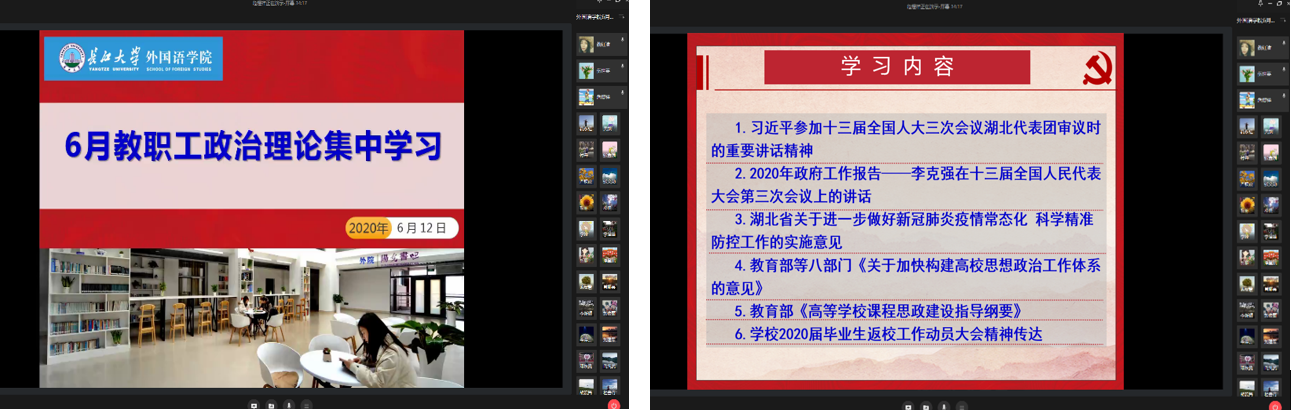 会上,党委书记危煜祥带领大家学习了习近平总书记参加十三届全国人大三次会议湖北代表团审议时的重要讲话精神和李克强总理在十三届全国人民代表大会第三次会议上所作的《政府工作报告》。他结合学院的实际,向老师们讲解了《湖北省委办公厅、省政府办公厅印发关于进一步做好新冠肺炎疫情常态化科学精准防控工作的实施意见》、教育部等八部门印发的《关于加快构建高校思想政治工作体系的意见》、教育部印发的《高等学校课程思政建设指导纲要》等三个文件的主要内容。政治理论学习结束后,他向全院教师传达了校党委书记朱业宏和校长冯征在学校2020届毕业生返校工作动员大会上的讲话精神,并就我院毕业生返校相关工作提出了要求。