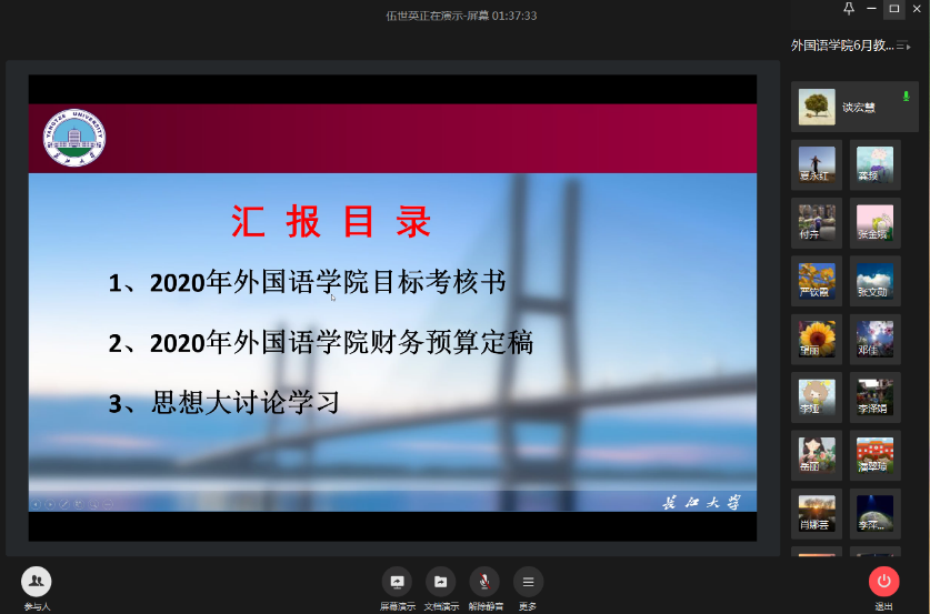 最后,院长谈宏慧向大家讲解了学院与学校签字的《2020年必赢bwin官方网站目标考核书》主要考核指标情况;对学院2020年的财务预算进行了讲解和说明;对学校要求组织开展的“必赢bwin官方网站办学思想大讨论”进行了安排部署,6月21日前以系(部、室)为单位组织开展讨论,6月23日学院组织集中研讨交流,各系(部、室)选派代表进行交流发言。她希望全院教职工积极参与到办学思想的讨论中来,主动为学院“十四五”规划的制定建言献策,促进学院健康稳定发展。