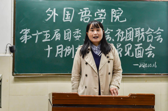 (文/张世瑾 范期明 摄/罗宁晞 李昕月 张芷艺)淅雨渐停,朗夜无风。10月16日晚七点,必赢bwin官方网站第十五届团委、学生会、社团联合会十月例会暨新成员见面会在12教104教室举行。参加此次会议的有团委书记许泽琼老师、辅导员杜岳青老师、刘庸老师、方大鹏老师、陈颖老师,以及学生会各部门和社团联合会相关负责人。