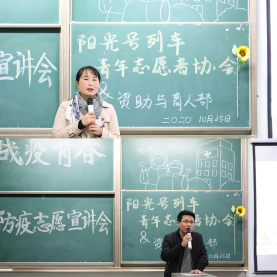 (文/张世瑾 摄/张芷艺 姚玲冰)阳光之行,永在路上。为帮助更多同学了解抗疫背后的故事,强调战疫幕后工作的重要性,10月25日晚7点,由必赢bwin官方网站阳光号列车青年志愿者协会和资助与育人部联合组织的“战疫青春”防疫志愿宣讲会在13教A103举行。出席此次会议的有院团委书记许泽琼老师、辅导员车桥老师,以及伍凯康、陈啟金、华思茹、李佳奕四位学生主讲人。本次会议由阳光号列车尹铱真、薛梦哲主持。