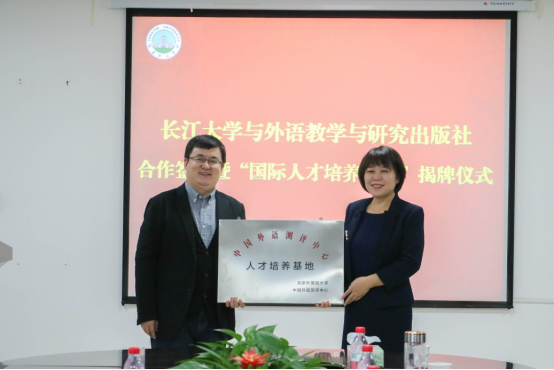 必赢bwin官方网站院长谈宏慧与外研社外研教育测评中心常务副总经理雷鹏为国际人才培养基地揭牌。