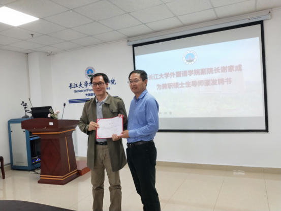 副院长谢家成教授向出席仪式的兼职导师颁发聘书。他们分别是第二批荆楚教育名家毛庆龙、荆州市教科院英语教研员陈勇、沙市区教育科学研究院英语教研员钟传银、荆州中学英语名师李云标、沙市实验中学英语特级教师邱煜。