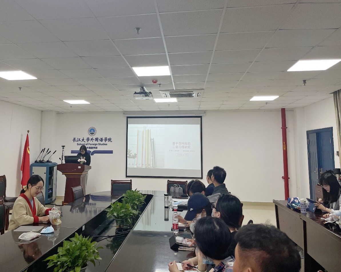 陈传甫同学从引言、前人研究、研究步骤等几个方面介绍了基于语料库的中国英语学习者写作评价资源特征研究。她指出:中国英语学习者议论文写作语篇整体评价意义欠缺,引导和说服读者方面存在显著不足。介绍完毕后,陈松松老师对其汇报内容进行了点评,“当我们中国英语学习者在写议论文时,往往只注重议论文的说教性而忽视了其对话性,这是值得我们学习者反思的。”