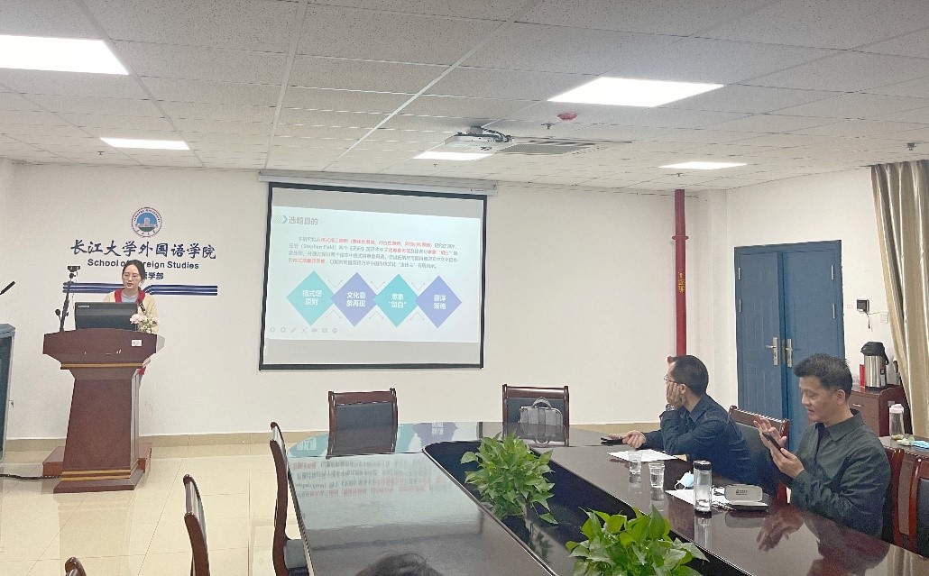 周玲同学则分享了从格式塔三原则研究许渊冲、田笠的《天问》译本中文化意象再现及译者对意象“留白”现象处理,并通过对两个译本中格式塔意象再造,尝试归纳尽可能再现原文中文化信息的格式塔翻译策略,以期对典籍英译乃至中国传统文化“走出去”有所启示。介绍完毕后,田传茂老师对其汇报内容进行了点评,指出单靠举例方式不能归纳出译者的格式塔翻译策略,要利用量化研究来收集数据,这样得出结论才更有可信度。