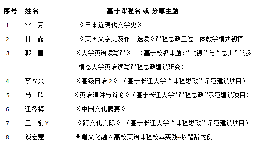 第二阶段由学院8名教师分别围绕具体课程展开分享,分享教师涵盖全院所有系部;课程类型多样,包括文学、文化、语言基础及技能培养等各种类型;大多分分享是基于所申报的省级或校级教学研究课题(具体分享主题如下表)。