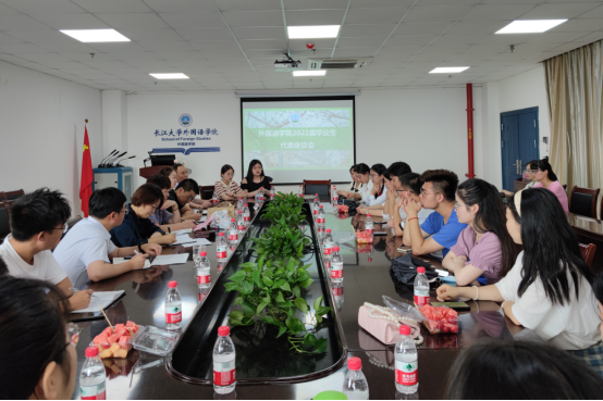 会上,21名毕业生代表先后发言,畅谈身为长大人、外语人的荣光与自豪、责任与使命,毕业生们悉数成长收获、感恩师友教泽、献言学校学院发展,根据在校期间的学习情况、社会实践、心理体验和生活经历,围绕学院课程设置、教学、实习实践活动、学生管理服务工作等方面提出了很多中肯的意见和建议。参会老师纷纷向毕业生表达了殷切的期望、亲切的鼓励和深情的祝福,希望毕业生同学们在今后学习和工作中永葆学习热情,注重传承与创新,不忘初心,砥砺奋进。