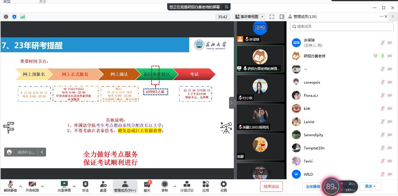 为了进一步了解学生研考复习进度,安抚学生在研考路上的焦虑情绪,理清研考路上需要注意的各个节点,9月20日晚上7点,我院通过腾讯会议的形式举行了学院本科生考研动员大会。学校研工部黄龙老师、学院付小秋副院长,辅导员许泽琼老师及19级、20级100多名研考学生参会。