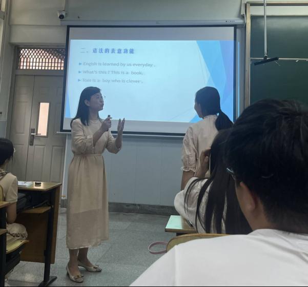 讲座主要围绕Larsen Freeman的三维语法理论、新教材中语法设置以及语法教学实践三个方面展开。罗之慧老师首先阐述了新课标对语法教学的具体要求,接着针对传统语法教学中存在的形式中心、忽视交际、教学方法机械等问题,引入Larsen Freeman的三维语法理论,并通过大量实例阐释了语法的形式、意义与使用三者的关系,引导大家通过实例分析,深刻认识英语语法教学中普遍存在的对语法意义与使用相对关注不足的问题。