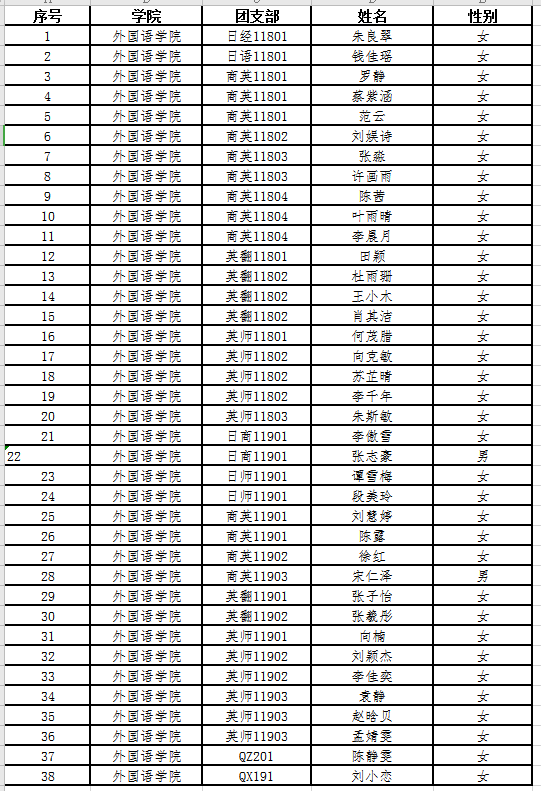 根据《共青团推优入党工作实施办法(试行)》(中青发〔2019〕9号)、《共青团必赢bwin官方网站委员会推优工作实施细则》(长大团发〔2017〕8号)文件精神,经各班团支部大会推优投票表决、院团委审核,报外语学院党委审查同意,2021年上半年(非毕业年级)团内“推优”为发展对象的名单公示如下:
