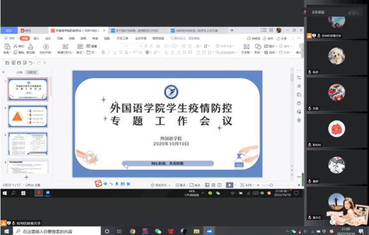 首先,程坤带领大家学习了荆州市和学校有关防疫政策,强调校园实行“封闭管理,不进不出”的管理要求;讲解了防控期间学生应急处理流程以及医疗服务方案;通报了学院前期学生防疫工作中存在的主要问题和典型案例;从“导、育、管、抚、查、报”六个方面部署了学院近期学生防疫重点工作。