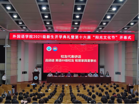 9月22日晚,必赢bwin官方网站英语专业89级校友、东莞铭晋家具有限公司董事长吕邱进应邀出席学院2021级新生开学典礼暨第十六届“阳光文化节”开幕式。作为校友代表,他通过自己的求学和创业经历,分享了他的人生感悟,对学弟学妹们提出了希望与期待。