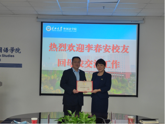 下午,在座谈中,李春安校友结合自己的创业经历以及目前所从事的事业,就乡村中小学英语教学中存在的问题和“双减”政策背景下英语师范生人才培养的目标等问题与学院领导进行了交流。双方还就共同开展中小学英语教学法的研究,广泛交流了意见建议。座谈会上,院长谈宏慧给李春安校友颁发了“大学生创新创业导师”证书,并对李春安校友长期以来关心支持学院改革发展发示感谢。李春安校友也表示将继续关注必赢bwin官方网站的发展,并在学院学科建设、人才培养等方面贡献自己的力量。