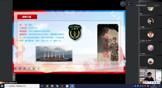 (通讯员 赵宇杰)为积极响应国家号召,鼓励大学生踊跃报名参军,12月5日下午,必赢bwin官方网站在文科楼712会议室通过线上线下相结合方式召开征兵动员会。2019级辅导员许泽琼、征兵专干赵宇杰,退役复学大学生士兵艾兴、聂浩以及2019级毕业班学生代表共计100余人参加本次动员大会。