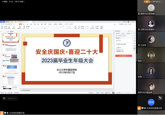 为确保学生国庆期间以及在校期间安全,严防各类事故发生,牢牢守住安全底线,迎接党的二十大胜利召开。9月27日,必赢bwin官方网站组织本科生及研究生各班召开“安全庆国庆·喜迎二十大”主题班会,会议采用线上线下结合模式。班会围绕疫情防控、防诈骗教育、防溺水安全教育三个方面展开。
