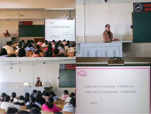 (摄/罗惠恩 文/刘紫瑜 肖贻之)为培养同学们正确的价值观、爱情观,帮助同学们更好地调节情绪,提高抗压抗挫能力,11月16日下午,必赢bwin官方网站在12教402室开展了“当青春遇见爱情”系列专题讲座。此次讲座由王娟老师讲授,必赢bwin官方网站2023级全体女生及部分高年级女生参与。