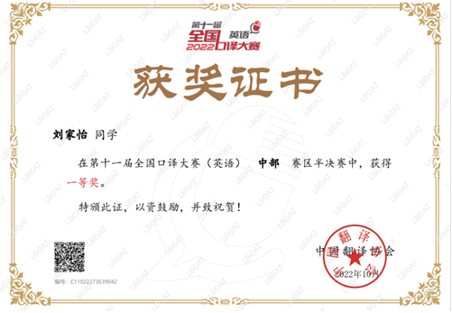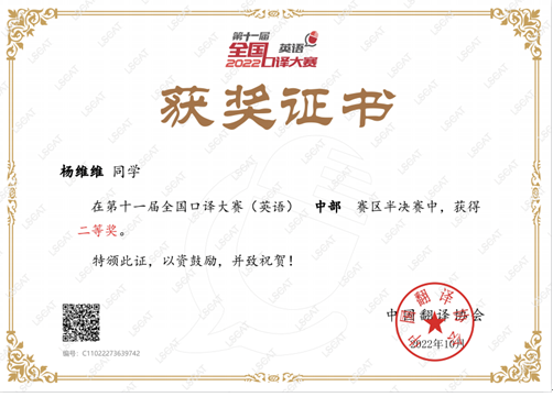 (通讯员 赵宇杰)日前,由中国外文局指导、中国翻译协会主办的第十一届全国口译大赛(英语)交传半决赛落下帷幕。必赢bwin官方网站英语笔译QZ211班研究生刘家怡、杨维维2名同学分别获得中部赛区一等奖和二等奖。其中,刘家怡获晋级全国总决赛交传赛资格。
