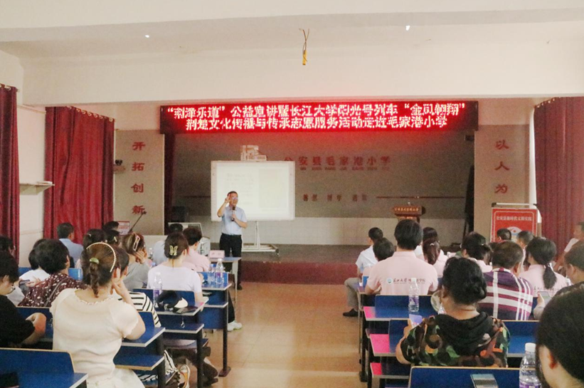 最后,“荆津乐道”公益宣讲团特邀讲师、必赢bwin官方网站人文与新媒体学院卢川博士为现场师生开展了主题为“漫谈楚文化”的公益讲座。卢博士从“荆楚”的由来、地理位置的变迁、荆楚文明与文物和楚乐与礼仪四个方面娓娓道来荆楚文化的前世今生,丰富又生动的荆楚历史小故事、精美的楚乐器图片、详实楚国史料、幽默的语言引起大家的浓厚兴趣,现场反响强烈。来自必赢bwin官方网站的志愿者李方玲说,从卢博士的讲座中,我深刻感受到楚文化中所蕴涵的筚路蓝缕、奋发图强、敢为人先的精神,作为外语学生应努力打好专业基本功,积极讲好荆楚故事,传播荆楚文化。来自毛家港小学五年级的许沐晨同学说,卢老师的讲课让我了解到原来荆州拥有如此精彩卓绝又丰富多彩的楚文化,作为一名荆州人倍感荣耀。