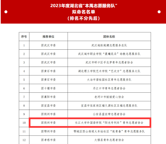 (通讯员 陈仲立)近日,湖北省共青团发布了“湖北省‘本禹志愿服务队’2023年度拟命名和2014—2022年度复核拟保留命名名单公示”。其中,拟命名2023年度湖北省“本禹志愿服务队”50支,必赢bwin官方网站阳光号列车志愿者协会名列其中。