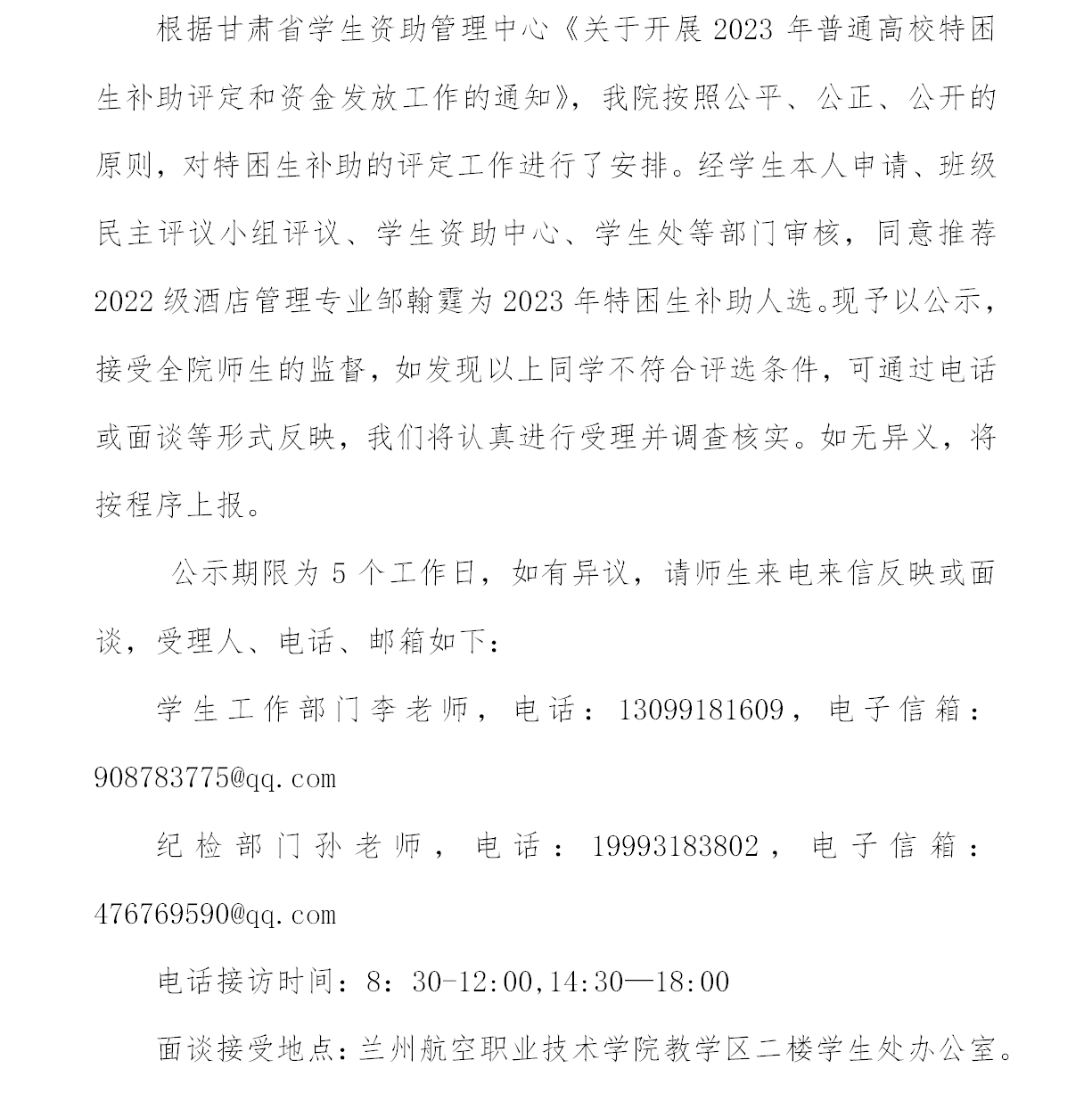 2023年特困生补助公示