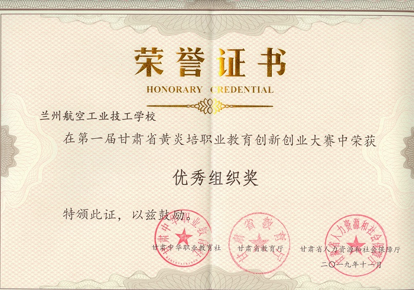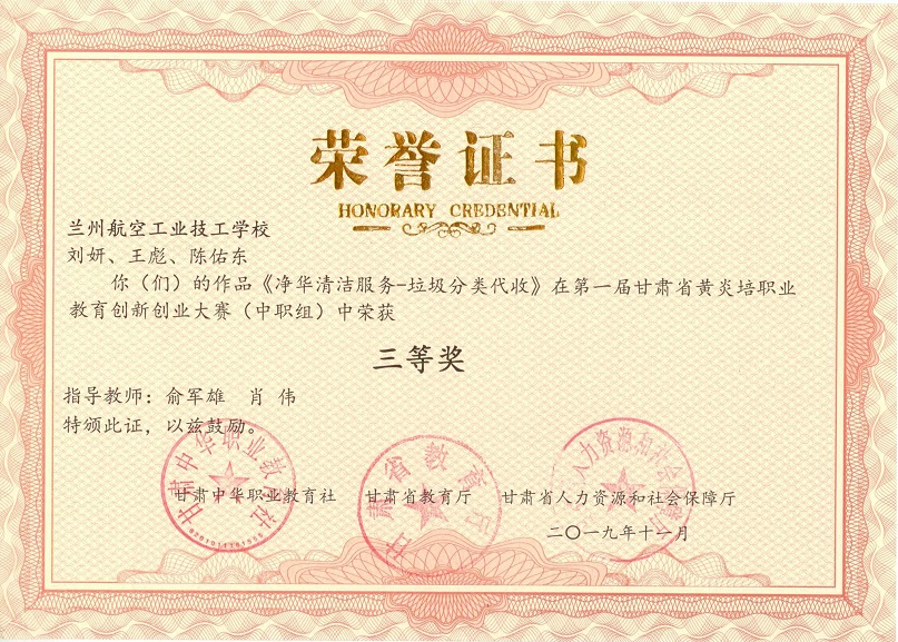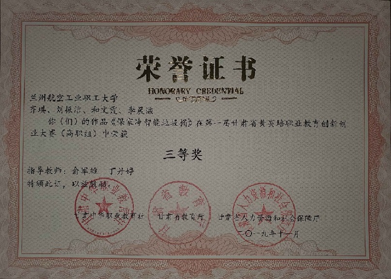 2019 年11月8日,第一届甘肃省黄炎培职业教育创新创业大赛在兰州资源环境职业技术学院举行,经过的激烈角逐,兰州航空工业职工大学报送的项目《保家净智能垃圾桶》荣获高职组三等奖,兰州航空工业技工学校报送的项目《田园牧歌无土栽培蔬菜生产基地开发》和《净化清洁服务-垃圾分类代收》荣获中职组三等奖,同时兰州航空工业技工学校获得“优秀组织奖”荣誉。