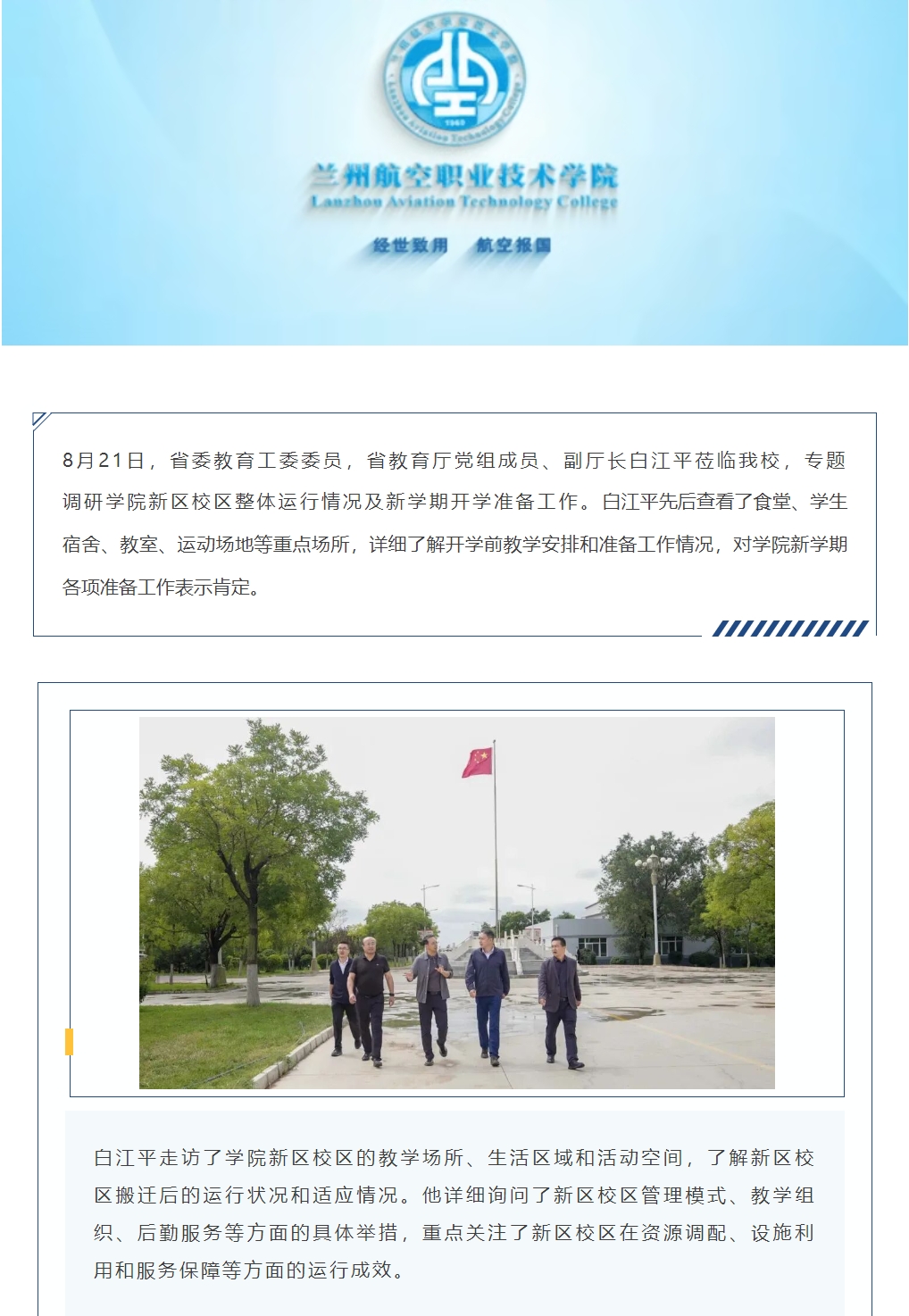 甘肃省教育厅副厅长白江平来校调研学院新学期开学准备情况