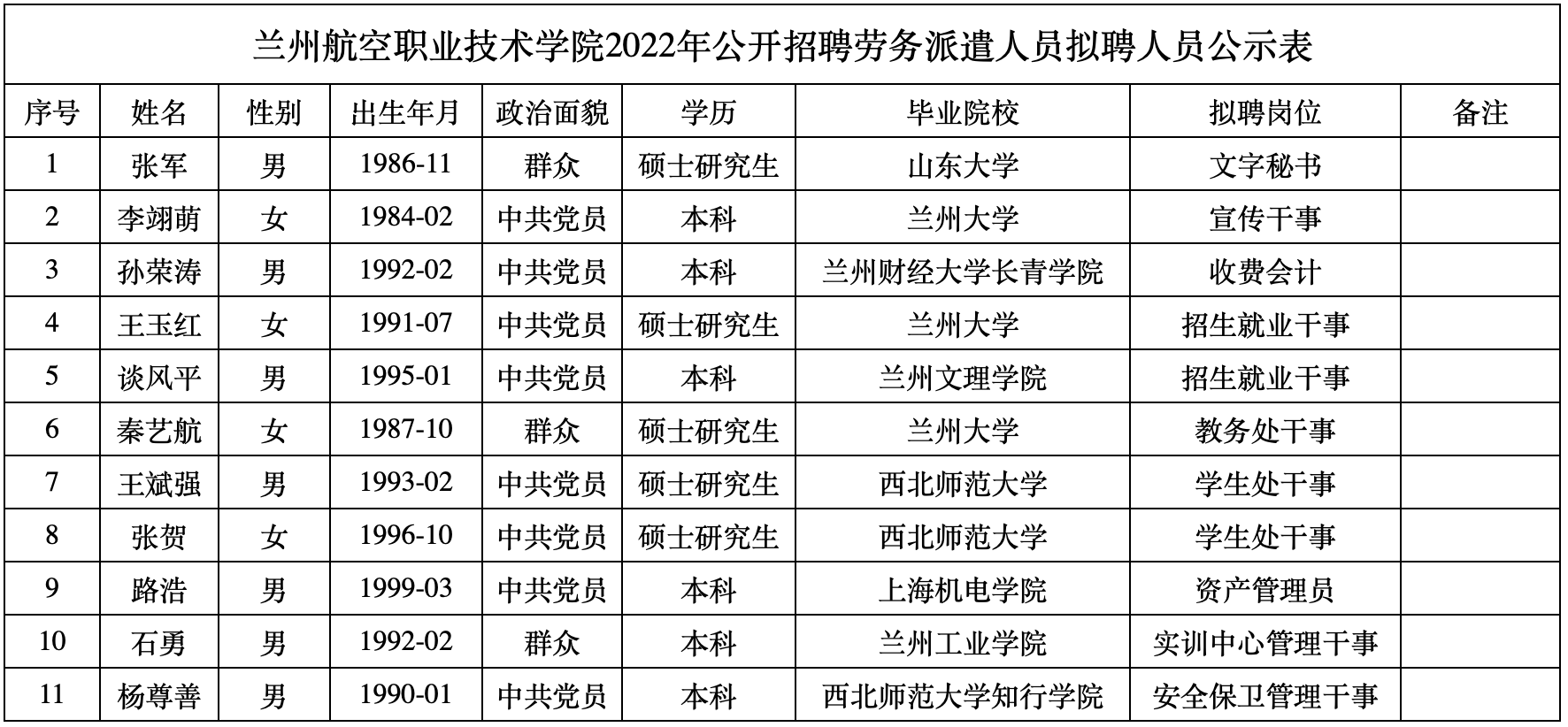 taptap点点体育2022年公开招聘劳务派遣人员拟聘人员公示