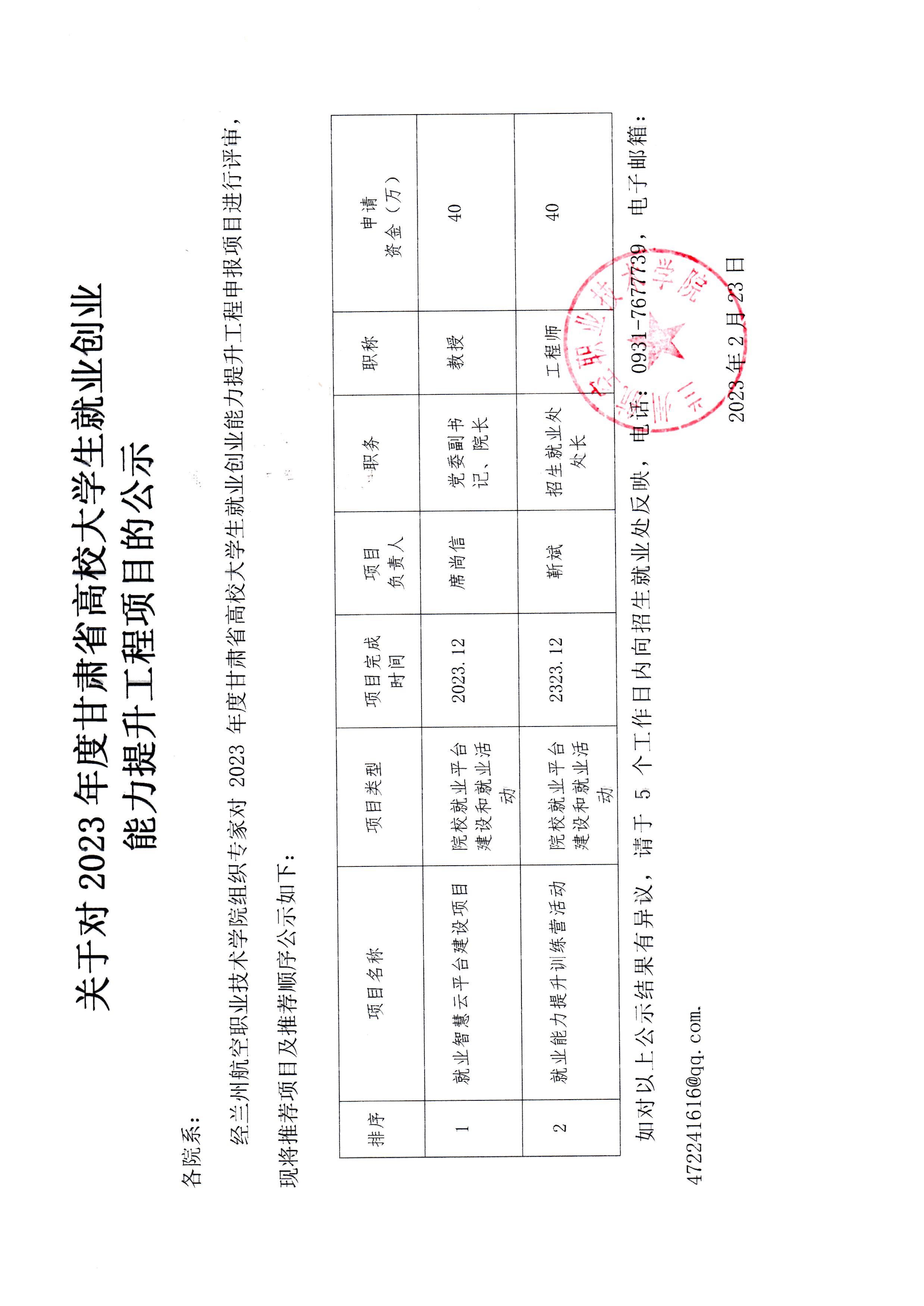 关于对 2023 年度甘肃省高校大学生就业创业能力提升工程项目的公示