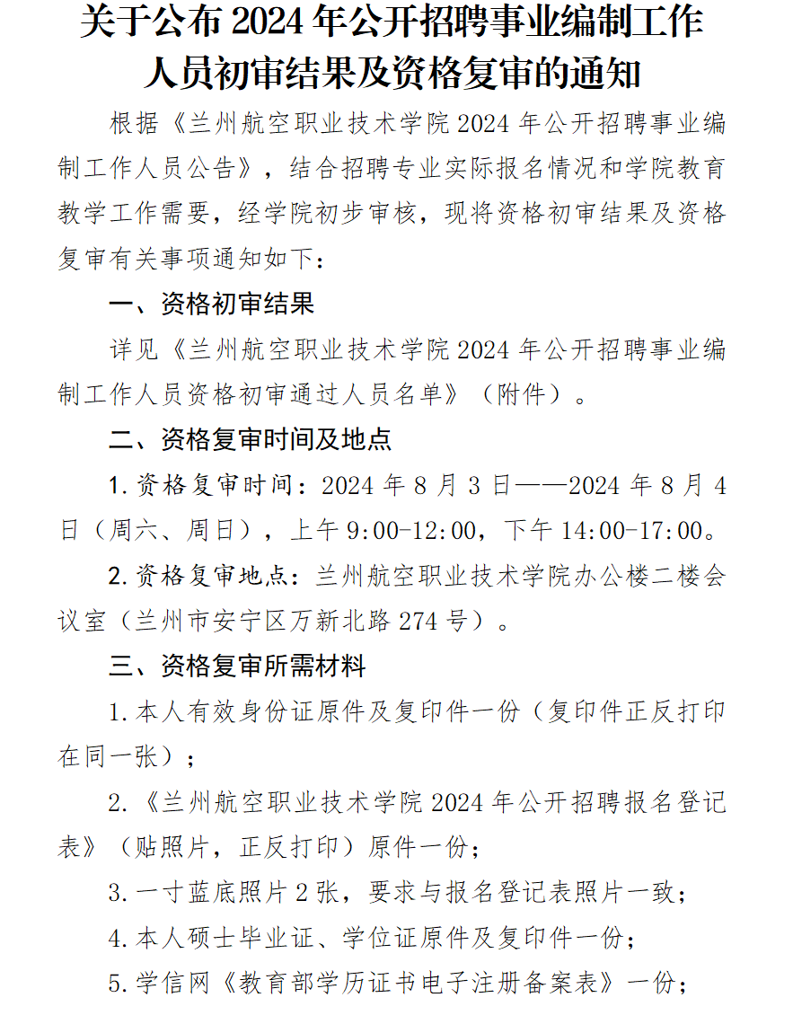 关于公布2024年公开招聘事业编制工作 人员初审结果及资格复审的通知