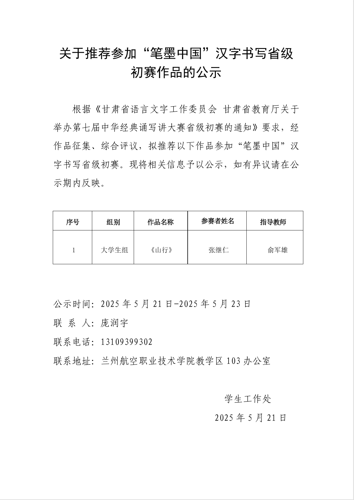 关于推荐参加“笔墨中国”汉字书写省级初赛作品的公示