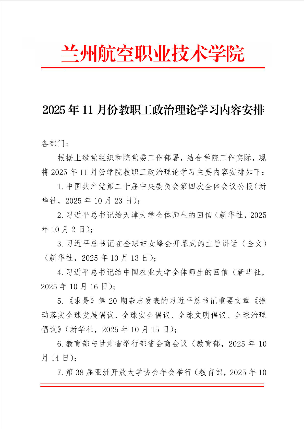 2025年11月份教职工政治理论学习内容安排